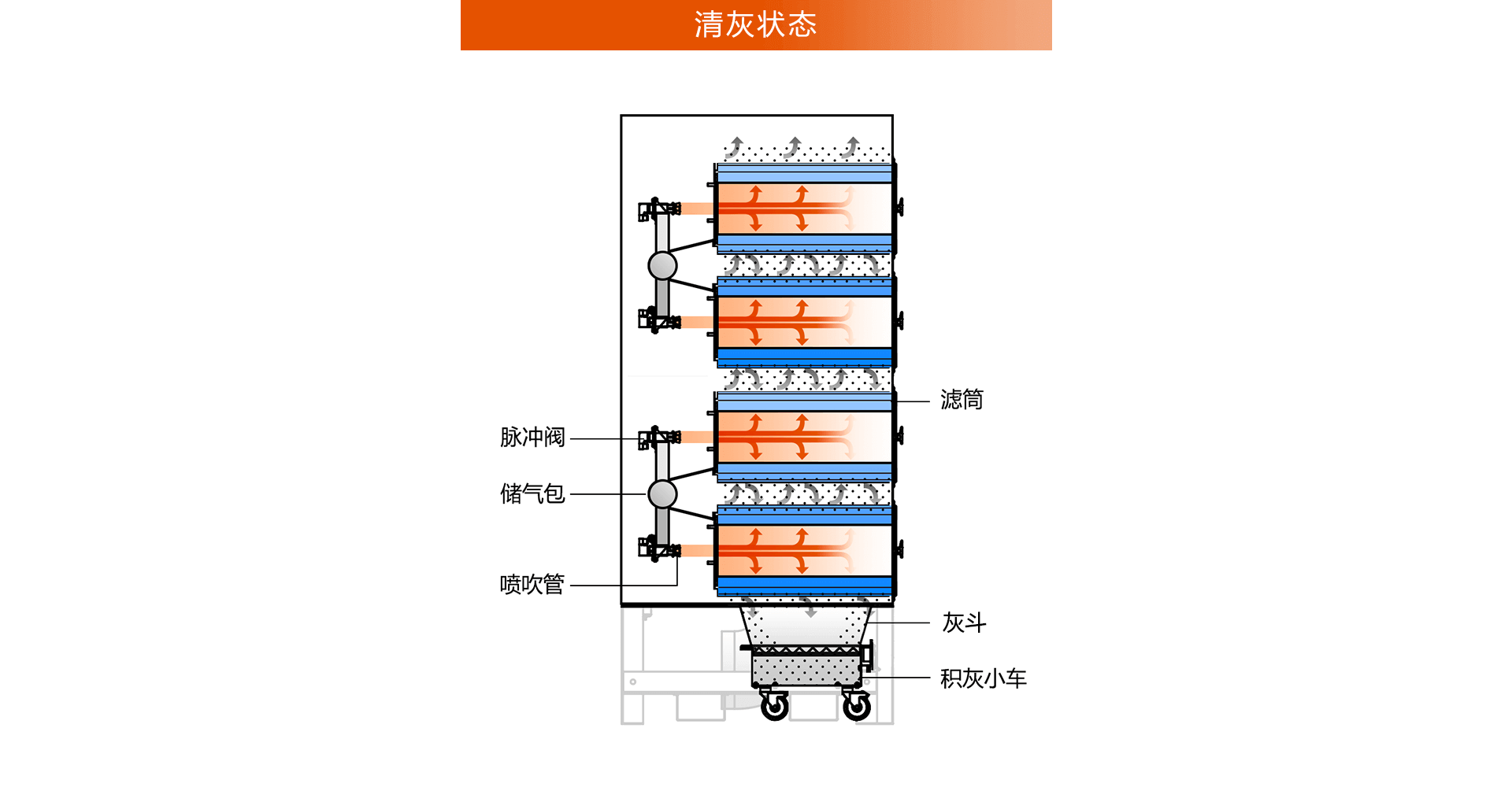 通過反復(fù)小幅度的沖擊振動,將積聚在濾筒外部的粉塵震落至灰斗內(nèi)。